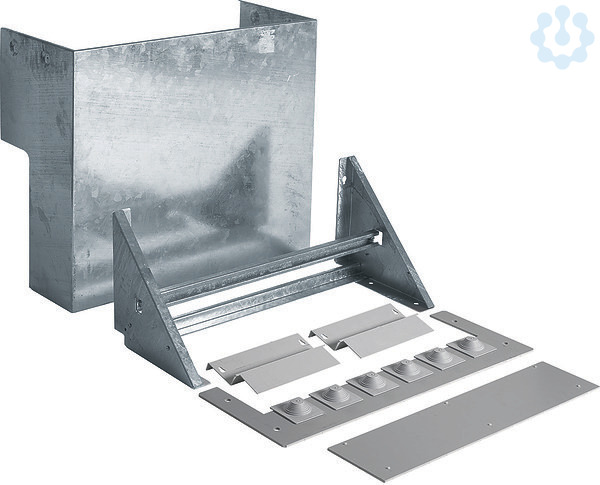 Wandkonsole, KVS, Größe 1, mit Abdeckplatte, 6 x Steckschieber, 50 - 185 mm².Wandkonsole aus feuerverzinktem Stahlblech. Mit seitlichen Öffnungen, Abdeckplatte, Steckschiebern mit abgestufter Dichtung für Kabel 50-185 mm² und C-Profilschiene für Bügelschellen als Zugentlastung für Leitungen.