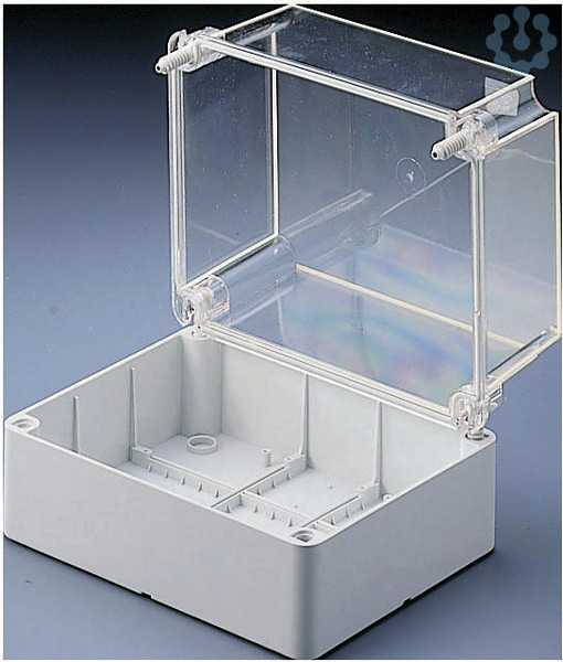 Abzweigkasten fuer elektrische und elektonische Geraete, eckig, mit glatten Waenden, transparentem hohem Schraubdeckel mit Edelstahlschrauben.