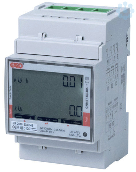 Dreiphasen-Energiezähler; Messwandler; 5A, 400V, 50/60Hz; Genauigkeitsklasse: B; Energieart: Wirk- und Blindleistung; Zulassung: MID-zertifiziert; Anzeigeart: digital; LCD mit Hintergrundbeleuchtung; Menügeführt über Touch-Display; Montageart: Einbau; Breite in Teilungseinheiten: 3TE; BxHxT (mm): 54x90x63; Ausführung der Schnittstelle: Modbus RS485; Schutzart: IP51; Umgebungslufttemperatur: -25°C bis +65°C
