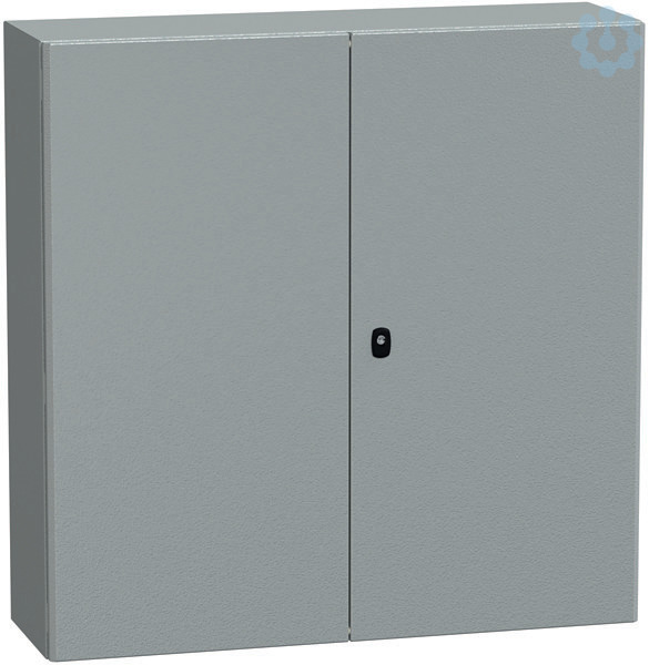 Wandschrank Spacial S3D aus Stahlblech mit Montageplatte. 1000 x 1000 x 300 mm. Korpus aus einem Stück gefalzt und verschweißt, verstärktes Vorderprofil in zweifacher Blechstärke als Regenrinnenprofil. Bündige Rückseite. IP66, IK10. Leicht aushängbare Tür, schneller Türanschlagwechsel, hervorragende Stabilität durch 20 mm starken Verstärkungsrahmen in doppelter Blechstärke, Türöffnung 120°, 2 oder 3 verdeckt liegende Scharniere. Dreipunktverschlusssystem mit nur einem Betätigungselement ab Bauhöhe 600 mm. Problemloser Gestängeumbau. Max. Belastbarkeit: 50 kg/m2. angefastes Türprofil, plasmaverschweißt, Beschichtung aus Epoxy-Polyester in RAL 7035.