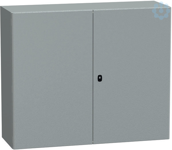 Spacial S3D Wandgehäuse aus Stahl mit 2 Volltüren. 1000 x 1200 x 400 mm. Einteiliges Gehäuse, inklusive Montageplatte. 3-Punkt-Verschlusssystem mit Griff und 3 mm Doppelbartschliessung. Aus Stahl, Epoxid-Polyester-Pulverbeschichtung. Schutzart IP 55, IK10, Farbe RAL 7035.