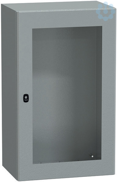 Spacial S3D Wandgehäuse aus Stahl mit Sichttür. Einteiliger Körper, ohne Montageplatte. 3-Punkt-Verschlusssystem mit Griff und 3 mm Doppelbartschliessung. Aus Stahl, Epoxid-Polyester-Pulverbeschichtung. Schutzart IP 66, IK08, Farbe RAL 7035. 1 Kabelverschraubungsplatte im Lieferumfang enthalten, Standard.