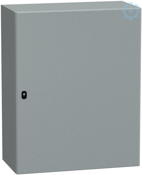 Spacial S3D Wandgehäuse aus Stahl mit Volltür. Einteiliges Gehäuse, inklusive Montageplatte. 3-Punkt-Verschlusssystem mit Griff und 3 mm Doppelbartschliessung. Aus Stahl, Epoxid-Polyester-Pulverbeschichtung. Schutzart IP 66, IK10, Farbe RAL 7035.