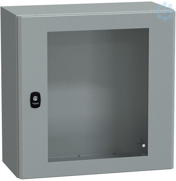Spacial S3D Wandgehäuse aus Stahl mit Sichttür. Einteiliger Körper, ohne Montageplatte. 3-Punkt-Verschlusssystem mit Griff und 3 mm Doppelbartschliessung. Aus Stahl, Epoxid-Polyester-Pulverbeschichtung. Schutzart IP 66, IK08, Farbe RAL 7035. 1 Kabelverschraubungsplatte im Lieferumfang enthalten, Standard.
