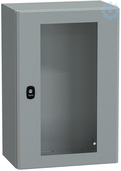 Spacial S3D Wandgehäuse aus Stahl mit Sichttür. 600 x 400 x 250 mm. Einteiliger Körper, ohne Montageplatte. 3-Punkt-Verschlusssystem mit Griff und 3 mm Doppelbartschliessung. Aus Stahl, Epoxid-Polyester-Pulverbeschichtung. Schutzart IP 66, IK08, Farbe RAL 7035. 1 Kabelverschraubungsplatte im Lieferumfang enthalten, Standard.