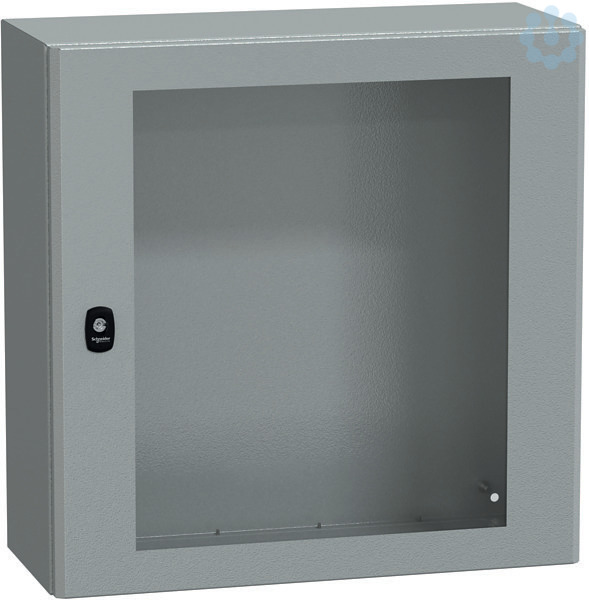 Spacial S3D Wandgehäuse aus Stahl mit Sichttür. Einteiliger Körper, ohne Montageplatte. 3-Punkt-Verschlusssystem mit Griff und 3 mm Doppelbartschliessung. Aus Stahl, Epoxid-Polyester-Pulverbeschichtung. Schutzart IP 66, IK08, Farbe RAL 7035. 1 Kabelverschraubungsplatte im Lieferumfang enthalten, Standard.