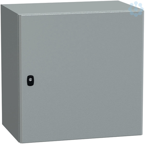 Spacial S3D Wandgehäuse aus Stahl mit Volltür. 600 x 600 x 250 mm. Einteiliges Gehäuse, inklusive Montageplatte. 3-Punkt-Verschlusssystem mit Griff und 3 mm Doppelbartschliessung. Aus Stahl, Epoxid-Polyester-Pulverbeschichtung. Schutzart IP 66, IK10, Farbe RAL 7035.