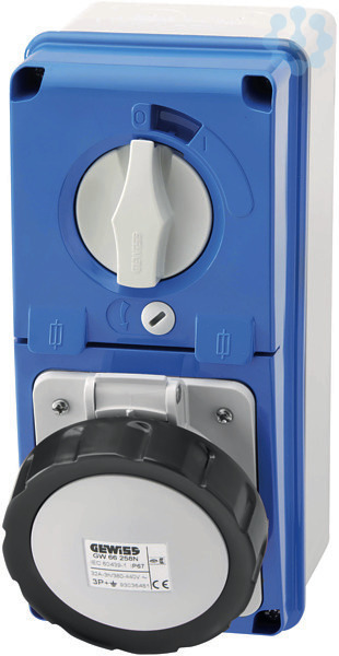 IEC Steckdose im Gehaeuse fuer senkrechte Anordnung mit Schalter und mechanischer Verriegelung. Der Schalter ist verriegelt und kann nur bei eingestecktem Stecker betaetigt werden. Durch ein Vorhaengeschloss kann die IEC Steckdose wahlweise im ein- oder ausgeschalteten Zustand gesichert werden. Die Zylindersicherungen sind als Sicherungstrenner unterhalb des Schalterantriebs angeordnet. Durch Oeffnen der Klappe werden die Sicherungen gezogen und sind zur Wartung zugaenglich. Fuer die Bemessungsstroeme 16 und 32 A ist die Groesse 10,3x38 mm und fuer 63 A die Groesse 22x58 mm eingesetzt.