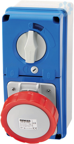 IEC Steckdose im Gehaeuse fuer senkrechte Anordnung mit Schalter und mechanischer Verriegelung. Der Schalter ist verriegelt und kann nur bei eingestecktem Stecker betaetigt werden. Durch ein Vorhaengeschloss kann die IEC Steckdose wahlweise im ein- oder ausgeschalteten Zustand gesichert werden. Die Zylindersicherungen sind als Sicherungstrenner unterhalb des Schalterantriebs angeordnet. Durch Oeffnen der Klappe werden die Sicherungen gezogen und sind zur Wartung zugaenglich. Fuer die Bemessungsstroeme 16 und 32 A ist die Groesse 10,3x38 mm und fuer 63 A die Groesse 22x58 mm eingesetzt.