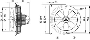Drehstrom-Ausführung: Axial-Wandventilator mit quadratischer Wandplatte, in Drehstromausführung. Kurzbeschreibung: Schutzgitter auf der Saugseite, Berührungsschutz gemäß DIN EN ISO 13857. 8-blättrige Flügelräder aus glasfaserverstärktem Polyamid. Thermischer Überlastungsschutz serienmäßig. Ventilatoren erfüllen die Anforderungen der europäischen Ökodesign Verordnung (EG) Nr.327/2011 Richtlinie 2009/125/EG. Vibrationsfreier Lauf durch dynamisch gewuchtetes Flügelrad und Motor (Welle-Rotor), gemäß Gütestufe 6.3, DIN ISO 1940, Teil 1. Hoher lüftungsseitiger Wirkungsgrad, niedriges Betriebsgeräusch. Erhöhte Langlebigkeit durch qualitativ hochwertige Materialien wie geräuscharme Kugellager. Ventilatoren sind wartungsfrei. Reversierbarer Betrieb der Ventilatoren möglich. Kundenspezifische Sonderspannungen als Sonderausführungen auf Anfrage und gegen Mehrpreis lieferbar. Einbau zur Be- und Entlüftung in jeder Lage möglich. Förderrichtung: Die Förderrichtung ist gekennzeichnet. Standard Abluftbetrieb, Förderrichtung über Motor saugend. Drehstrommotor: Asynchronmotor. Nicht zur Förderung wasserdampfgesättigter Luft geeignet. Bemessungsspannung 400 V, 50 Hz. Schutzart IP 55. Ausnahme bei Typ DZQ ... D IP 54. Drehzahlsteuerbar. Ausnahme bei Typ DZQ 40/2 B und DZS 40/2 B. Geräte lassen sich mit einem optionalen 5-Stufentransformator stufenweise schalten. Reversierbar. Reversierbetrieb: Der Volumenstrom verringert sich um ca. 35 % bei anormaler Förderrichtung. Thermischer Überlastungsschutz serienmäßig. Ausnahme bei Typ DZQ/DZS 25/4 D und polumschaltbaren Axial-Wandventilatoren auf Anfrage erhältlich. Die Anschlüsse sind potenzialfrei auf Klemmen geführt und müssen an einen Motorvollschutzschalter z.B. MV 25 oder den Steuerstromkreis eines Schützes angeschlossen werden. Polumschaltbare Ventilatoren: Überlastungsschutz mit bauseitig zu beschaffendem Motorvollschutzschalter gewährleisten. Polumschaltbare Motoren mit den Drehzahlverhältnissen 8/4 oder 4/2 sind im Dahlanderprinzip geschaltet. Elektrischer Anschluss: An Klemmleiste im Abschlussdeckel des Motors. Sicherheitshinweise: Der Ventilator darf nur in Betrieb genommen werden, wenn der Berührungsschutz des Laufrades gemäß DIN EN ISO 13857 gewährleistet ist z.B. mit Maico Schutzgitter SG.Artikel: DZQ 40/8 B, Ausführung: Quadratische Wandplatte, Fördervolumen: 2050 m3/h, Drehzahl: 715 1/min, Laufradtyp: axial, Drehzahlsteuerbar: ja, Reversierbarkeit: ja, Spannungsart: Drehstrom, Bemessungsspannung: 400 V, Netzfrequenz: 50 Hz, Nennleistung: 75 W, INenn: 0,2 A, IMax: 0,2 A, Schutzart: IP 55, Wärmeklasse: B, Polumschaltbar: nein, Netzzuleitung: 7 / 1,5 mm2, Einbauort: Wand / Decke, Einbauart: Aufputz, Einbaulage: waagerecht / senkrecht, Material: Stahlblech, verzinkt, Farbe: silber, Gewicht: 11,22 kg, Gewicht mit Verpackung: 12,72 kg, Nennweite: 400 mm, Breite: 580 mm, Höhe: 580 mm, Tiefe: 246 mm, Breite mit Verpackung: 610 mm, Höhe mit Verpackung: 610 mm, Tiefe mit Verpackung: 400 mm, Fördermitteltemperatur bei Nennstrom: 60 °C, Fördermitteltemperatur bei IMax: -20 °C bis 60 °C, Verschlussklappe: ohne