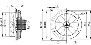 Drehstrom-Ausführung: Axial-Wandventilator mit quadratischer Wandplatte, in Drehstromausführung. Kurzbeschreibung: Schutzgitter auf der Saugseite, Berührungsschutz gemäß DIN EN ISO 13857. 8-blättrige Flügelräder aus glasfaserverstärktem Polyamid. Thermischer Überlastungsschutz serienmäßig. Ventilatoren erfüllen die Anforderungen der europäischen Ökodesign Verordnung (EG) Nr.327/2011 Richtlinie 2009/125/EG. Vibrationsfreier Lauf durch dynamisch gewuchtetes Flügelrad und Motor (Welle-Rotor), gemäß Gütestufe 6.3, DIN ISO 1940, Teil 1. Hoher lüftungsseitiger Wirkungsgrad, niedriges Betriebsgeräusch. Erhöhte Langlebigkeit durch qualitativ hochwertige Materialien wie geräuscharme Kugellager. Ventilatoren sind wartungsfrei. Reversierbarer Betrieb der Ventilatoren möglich. Kundenspezifische Sonderspannungen als Sonderausführungen auf Anfrage und gegen Mehrpreis lieferbar. Einbau zur Be- und Entlüftung in jeder Lage möglich. Förderrichtung: Die Förderrichtung ist gekennzeichnet. Standard Abluftbetrieb, Förderrichtung über Motor saugend. Drehstrommotor: Asynchronmotor. Nicht zur Förderung wasserdampfgesättigter Luft geeignet. Bemessungsspannung 400 V, 50 Hz. Schutzart IP 55. Ausnahme bei Typ DZQ ... D IP 54. Drehzahlsteuerbar. Ausnahme bei Typ DZQ 40/2 B und DZS 40/2 B. Geräte lassen sich mit einem optionalen 5-Stufentransformator stufenweise schalten. Reversierbar. Reversierbetrieb: Der Volumenstrom verringert sich um ca. 35 % bei anormaler Förderrichtung. Thermischer Überlastungsschutz serienmäßig. Ausnahme bei Typ DZQ/DZS 25/4 D und polumschaltbaren Axial-Wandventilatoren auf Anfrage erhältlich. Die Anschlüsse sind potenzialfrei auf Klemmen geführt und müssen an einen Motorvollschutzschalter z.B. MV 25 oder den Steuerstromkreis eines Schützes angeschlossen werden. Polumschaltbare Ventilatoren: Überlastungsschutz mit bauseitig zu beschaffendem Motorvollschutzschalter gewährleisten. Polumschaltbare Motoren mit den Drehzahlverhältnissen 8/4 oder 4/2 sind im Dahlanderprinzip geschaltet. Elektrischer Anschluss: An Klemmleiste im Abschlussdeckel des Motors. Sicherheitshinweise: Der Ventilator darf nur in Betrieb genommen werden, wenn der Berührungsschutz des Laufrades gemäß DIN EN ISO 13857 gewährleistet ist z.B. mit Maico Schutzgitter SG.Artikel: DZQ 50/84 B, Ausführung: Quadratische Wandplatte, Fördervolumen: 4370 m3/h / 8890 m3/h, FördervolumenNenn: 3040 m3/h / 6600 m3/h / im opt. Wirkungsgrad, Druck pfs, Nenn: 38 Pa - 145 Pa - im opt. Wirkungsgrad, Drehzahl nNenn: 730 1/min - 1460 1/min - im opt. Wirkungsgrad, Drehzahl: 735 1/min / 1473 1/min, Laufradtyp: axial, Drehzahlsteuerbar: ja, Reversierbarkeit: ja, Spannungsart: Drehstrom, Bemessungsspannung: 400 V, Netzfrequenz: 50 Hz, Nennleistung: 140 W / 695 W / im opt. Wirkungsgrad, INenn: 0,5 A / 1,4 A / im opt. Wirkungsgrad, IMax: 2 A, Schutzart: IP 55, Wärmeklasse: F, Polumschaltbar: ja, Polanzahl bei hoher Drehzahl: 4, Polanzahl bei niedriger Drehzahl: 8, Netzzuleitung: 5 / 1,5 mm2, Einbauort: Wand / Decke, Einbauart: Aufputz, Einbaulage: waagerecht / senkrecht, Material: Stahlblech, verzinkt, Farbe: silber, Gewicht: 23,59 kg, Gewicht mit Verpackung: 26,5 kg, Nennweite: 500 mm, Breite: 700 mm, Höhe: 700 mm, Tiefe: 348 mm, Breite mit Verpackung: 730 mm, Höhe mit Verpackung: 730 mm, Tiefe mit Verpackung: 400 mm, Fördermitteltemperatur bei Nennstrom: 60 °C, Fördermitteltemperatur bei IMax: -20 °C bis 60 °C, Gesamteffizienz e: 38,2 %, Messkategorie: A, Effizienzkategorie: statisch, Effizienzgrad N: 45,6, VSD erforderlich: nein, Herstellungsjahr: siehe Typenschild, Herstellername / Amtliche Registriernummer / Niederlassungsort des Herstellers: Maico Elektroapparate-Fabrik GmbH / Registergericht Freiburg, HRB 601233 / Villingen-Schwenningen, PBEP / FördervolumenBEP / Pfs, BEP: 0,695 kW / 6600 m3/h / 145 Pa, nBEP: 1460 1/min, spezifisches Verhältnis: ca. 1, Informationen zur Zerlegung und Entsorgung: siehe Montageanleitung, Informationen zu Einbau, Betrieb und Instandhaltung: siehe Montageanleitung, Verwendete Gegenstände bei der Effizienz-Messung, die nicht durch die Messkategorie beschrieben sind: -, SchallleistungspegelLWA7: 65 dB(A) / 82 dB(A), Verschlussklappe: ohne