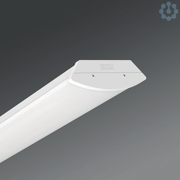 Leuchtenkörper Stahlblechprofil, trapezförmig gekantet, Stirnseiten weiß aus Polycarbonat, Leitungseinführungen Nähe Leuchtenmitte, Wannenbefestigung durch einrasten, Lichtverteilung direkt diffus mittels Wannenprofil aus Acrylglas in satine Optik, konvex mit innenliegenden Längsprismen, aufsteckbare weiße Stirnseiten aus Polycarbonat, UV-stabilisiert, Elektrischer Anschluss über 3-polige Anschlussklemme in Steckkontakt-Technik.