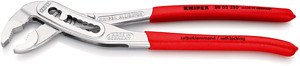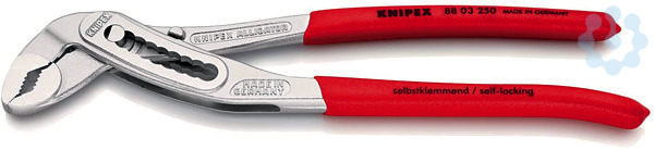 88 03 250 KNIPEX Alligator® guter Zugang zum Werkstück durch schlanke Bauform im Kopf- und Gelenkbereich. mehr Leistung und Komfort im Vergleich zu herkömmlichen Wasserpumpenzangen gleicher Länge: 9-stufige Rastenverstellung für 30 % mehr Greifkapazität. Selbstklemmend an Rohren und Muttern: kein Abrutschen am Werkstück, kraftsparendes Arbeiten. Greifflächen mit spezialgehärteten Zähnen, Härte der Zähne ca. 61 HRC: dauerhaft sicheres Greifen durch hohe Verschleißfestigkeit. Durchgestecktes Gelenk: hohe Stabilität durch doppelte Führung. Robuste Bauart, unempfindlich gegen Verschmutzung; besonders geeignet für Arbeiten im Außenbereich. Klemmschutz verhindert Quetschverletzungen. - Einstellpositionen: 9 - Kapazität für Rohre Zoll (Durchmesser): Ø 2 - Kapazität für Muttern, Schlüsselweite (mm): 46mm - Kapazität für Rohre (Durchmesser): Ø 50mm