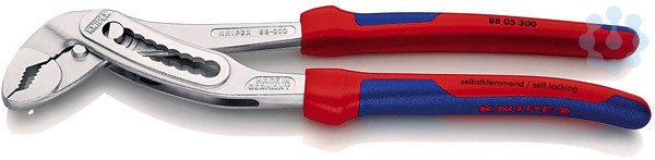 88 05 300 KNIPEX Alligator® guter Zugang zum Werkstück durch schlanke Bauform im Kopf- und Gelenkbereich. mehr Leistung und Komfort im Vergleich zu herkömmlichen Wasserpumpenzangen gleicher Länge: 9-stufige Rastenverstellung für 30 % mehr Greifkapazität. Selbstklemmend an Rohren und Muttern: kein Abrutschen am Werkstück, kraftsparendes Arbeiten. Greifflächen mit spezialgehärteten Zähnen, Härte der Zähne ca. 61 HRC: dauerhaft sicheres Greifen durch hohe Verschleißfestigkeit. Durchgestecktes Gelenk: hohe Stabilität durch doppelte Führung. Robuste Bauart, unempfindlich gegen Verschmutzung; besonders geeignet für Arbeiten im Außenbereich. Klemmschutz verhindert Quetschverletzungen. - Einstellpositionen: 9 - Kapazität für Rohre Zoll (Durchmesser): Ø 2 3/4 - Kapazität für Muttern, Schlüsselweite (mm): 60mm - Kapazität für Rohre (Durchmesser): Ø 70mm