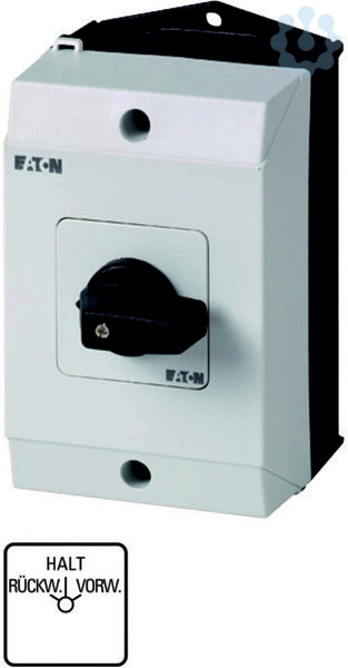 Wendeschalter, Sortiment: Steuerschalter, Typkenner: T0, mit schwarzem Knebel und Frontschild, Kontakte: 6, Schutzart: IP65, Bauform: Aufbau, Schaltwinkel: 45 °, Schaltverhalten: rastend, mit HALT-Stellung, Frontschild: Rückwärts-Halt-Vorwärts, Bemessungsbetriebsleistung AC-23A, 50 - 60 Hz 400 V: P = 5.5 kW, Bemessungsdauerstrom: Iu = 20 A, 3 Baueinheit(en), Normen und Bestimmungen: IEC/EN 60947, VDE 0660, IEC/EN 60204, Lasttrennschalter nach IEC/EN 60947-3