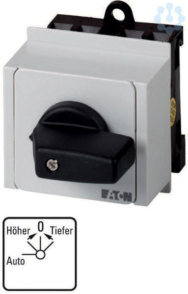 Wendeschalter, Sortiment: Steuerschalter, Typkenner: T0, mit schwarzem Knebel und Frontschild, Kontakte: 6, Schutzart: Front IP30, Bauform: Verteilereinbau, Schaltwinkel: 45 °, Schaltverhalten: rastend, mit 0-Stellung, mit 2-seitigem Rückzug nach 0, Frontschild: Aus-Höher>0<Tiefer, Bemessungsbetriebsleistung AC-23A, 50 - 60 Hz 400 V: P = 5.5 kW, Bemessungsdauerstrom: Iu = 20 A, 3 Baueinheit(en), Normen und Bestimmungen: IEC/EN 60947, VDE 0660, IEC/EN 60204, CSA, UL, Lasttrennschalter nach IEC/EN 60947-3