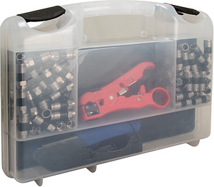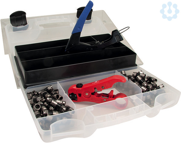 Kompressionsset, bestehend aus: 1 praktischer Kunstoffwerkzeugkoffer, 1x Kompressionszange (VT150), 1x Koax Abisolierer (Kabi), 100x Kompressionsstecker EX 6-51/83, geeignet für Kabel mit Dielektrikum Ø ca. 4,8 mm