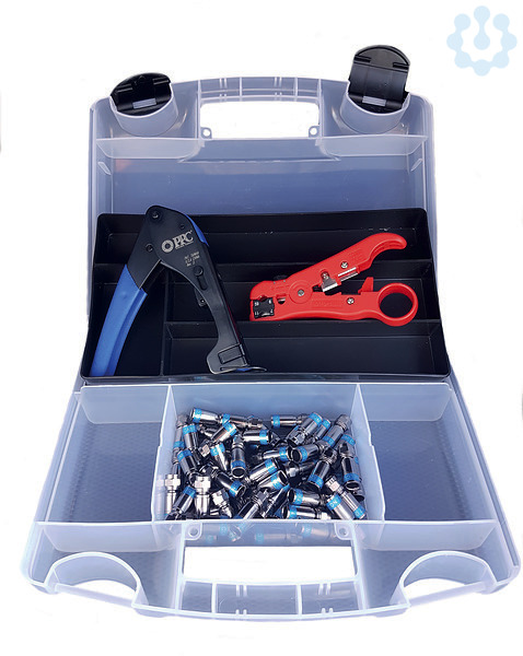 F56 CX Universal KompressionssetWerkzeugkoffer mit: Kompressionszange VT 150, Abisolierer KABI, 50x F-56 CX3 für sämtliche 7mm Koaxialkabel.