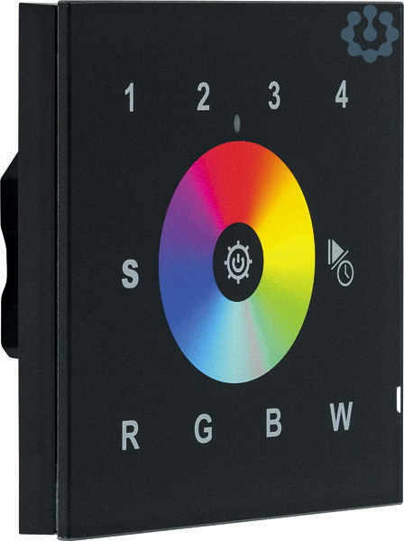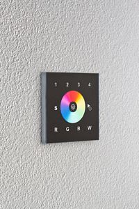 WIFI-Wandpanel für die Ansteuerung des WIFI-RGB-Controller. Steuerung von bis zu 4 separaten Zonen (Controllern). Für Schalterdosenmontage geeignet. Funktionen: Farbwechsel über Touch-Farbrad, Direktfarbwahl (rot, grün, blau und weiß), Ein- und ausschalten, so wie Programmwechsel.