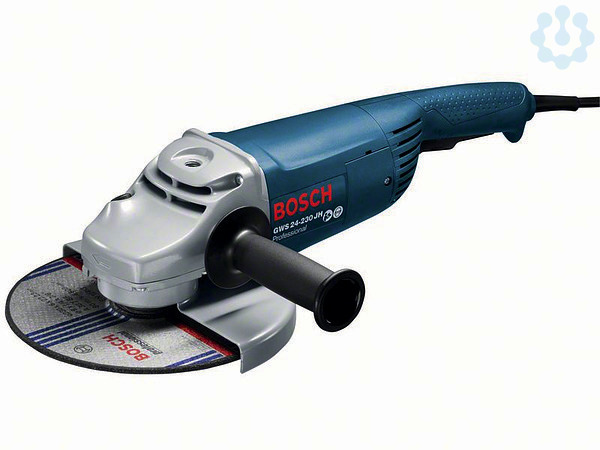 Winkelschleifer GWS 24-230 JH, Der Leistungsstarke mit geringem Gewicht, Leistungsstarker 2.400-Watt Champion-Motor für schnellen Arbeitsfortschritt, Kompakte Bauweise für gute Handhabung und Kontrolle der Maschine, Wiederanlaufschutz verhindert selbstständiges Wiederanlaufen der Maschine nach einer Stromunterbrechung, Zusatzhandgriff (1 602 025 022); Aufnahmeflansch (1 605 703 099); Spannmutter (1 603 340 040); Schutzhaube (2 605 510 298); Zweilochschlüssel (1 607 950 048)