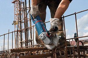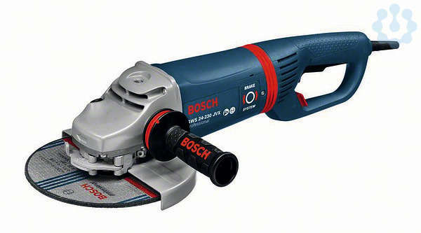 Winkelschleifer GWS 24-230 JVX, Der kabelgebundene große Winkelschleifer GWS 24-230 JVX Professional mit Bremssystem in der 2.400-Watt-Klasse liefert ausdauernde Schleifleistung. Sein kraftvoller 2.400-Watt-Motor sorgt für gute Ergebnisse bei anspruchsvollen Arbeiten. Der Anwenderschutz ist bei diesem Schleifer dank der patentierten Auslaufbremse mit einer Bremszeit von 2,5 Sekunden besonders hoch. Das Gerät verfügt über einen Haupthandgriff mit Vibration Control und einen Zusatzgriff mit Vibration Control, wodurch bis zu 50 % der Vibration absorbiert werden. Dieses Elektrowerkzeug wurde zum Schleifen von Metall konzipiert. Das Gerät ist sowohl mit der Absaughaube GDE 230 FC-T Professional als auch dem Bosch Click & Clean System kompatibel. Der GWS 24-230 JVX Professional verfügt auch über eine Schutzhaube. Aufnahmeflansch (1 605 703 099); Spannmutter (1 603 340 040); Schnellverstellbare Schutzhaube (2 605 510 281); Schnellspannmutter SDS (1 603 340 031); Tri-Control-Schalter; Zweilochschlüssel (1 607 950 048); Zusatzhandgriff Vibration Control (2 602 025 181)