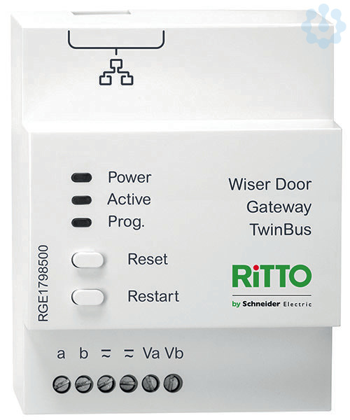 Das Ritto Door Gateway TwinBus verbindet eine TwinBus-Installation per LAN-Kabel mit RJ45-Stecker mit dem IP-Netzwerk (LAN). Zur Verwendung der App Ritto Door kann eine Verbindung zum IP-Netzwerkrouter (LAN) per LAN-Kabel mit RJ45-Stecker hergestellt werden. Für die Montage auf Hutschienen TH35 nach EN60715. Die Spannungsversorgung erfolgt über ein TwinBus Netzgerät 1757301, sowie eine zentrale oder dezentrale Video-Spannungsversorgung. Bei mehr als 15 Wiser Door Gateway an einem TwinBus Netzgerät 1757301 sind Verstärker 1757500 zu verwenden. Mit Schraubklemmen. Manuelle Bedienung am Gerät Reset (auf Werkseinstellung), Neustart (Installationseinstellungen bleiben erhalten).