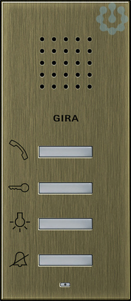 Wohnungsstation AP Bronze System 55 - Bedientasten mit integrierten Leuchtdioden zur Zustandsanzeige. Die Bedientasten der Wohnungsstation AP steuern die folgenden Funktionen in Verbindung mit dem Schaltaktor oder dem Unterputz-Schaltaktor:: - Schalten von Licht und anderen Funktionen. - Ansteuerung des Türöffners. - Einstellen der Ruftonmelodie. - Rufton ein- und ausschalten. - Rufannahme. - Aktivierung der Durchsetzfunktion. - Einstellung von Rufton- und Sprechlautstärke. Mit dieser Komponente ist der Aufbau von Türkommunikationsanlagen mit bis zu 70 Teilnehmern möglich (z. B. 1 x Einbaulautsprecher, 5 x Erweiterungsmodul für Einbaulautsprecher, 68 x Wohnungsstation AP).