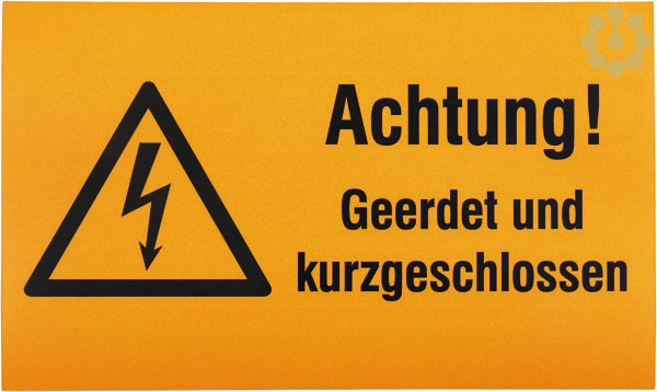 Warnschild zum Aushang: "Achtung! Geerdet und kurzgeschlossen!"