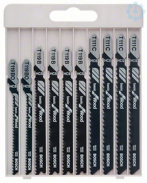 Das 10-tlg. Basic for Wood Stichsägeblatt-Set, Kassette, schneidet in Holz. Es enthält Blätter für gerade und Kurvenschnitte in Weichholz.