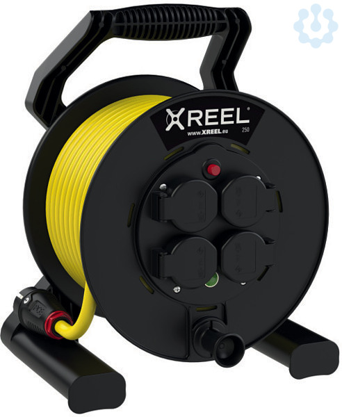 Kabeltrommel XREEL250; Kunststofftrommel (schwarz) mit zentral angeordneter, innenliegender Bremsvorrichtung; Abgedichteter Anschlussraum; Stabiles Kunststoffgestell (schwarz) mit ergonomisch geformtem Tragegriff und 2 Befestigungspositionen für den Stecker; Zentralscheibe mit 4 Schutzkontakt Anbausteckdosen österr./deutsch. System mit Klappdeckel und Shutter; Nennspannung: 250V ; Nennstrom: 16A; Schutzart: IP54; 1 Thermoschutzschalter; 1 Spannungskontrollleuchte (grün); 25m Kabel gelb N07V3V3-F 3G1,5mm2; Taurus2 Schutzkontaktstecker Gummi 16A 2p+PE 250V IP54 (0511-sr) nach österr./deutsch. System; XREEL250 betriebsfertig verdrahtet; Richtlinie (RoHS) 2011/65/EU; Niederspannungsrichtlinie NSpRl 2014/35/EU; Beständigkeit gegenüber UV-Strahlung nach ISO 4892-2; Normen: IEC / EN 61242