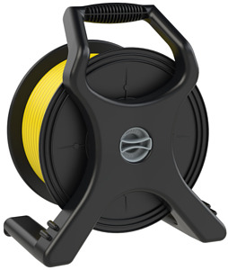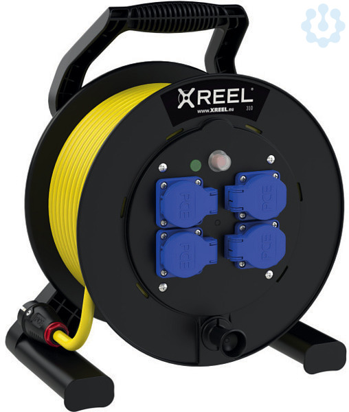 Kabeltrommel XREEL310; Kunststofftrommel (schwarz) mit zentral angeordneter, innenliegender Bremsvorrichtung; Abgedichteter Anschlussraum; Stabiles Kunststoffgestell (schwarz) mit ergonomisch geformtem Tragegriff und 2 Befestigungspositionen für den Stecker; Zentralscheibe mit 4 Schutzkontakt Anbausteckdosen österr./deutsch. System mit Klappdeckel und Dichtrand (105-0bsw); Nennspannung: 250V ; Nennstrom: 16A; Schutzart Anbaudosen: IP54; 1 Spannungskontrollleuchte; 50m Kabel gelb N07V3V3-F 3G1,5mm2; Taurus2 Schutzkontaktstecker Vollgummi 16A 2p+PE 250V IP54 (0522-sr) zweifaches Erdungssystem; XREEL310 betriebsfertig verdrahtet; Richtlinie (RoHS) 2011/65/EU; Niederspannungsrichtlinie NSpRl 2014/35/EU; Beständigkeit gegenüber UV-Strahlung nach ISO 4892-2; nach Norm IEC/EN 61242; Schutzart Gesamtsystem: IP54