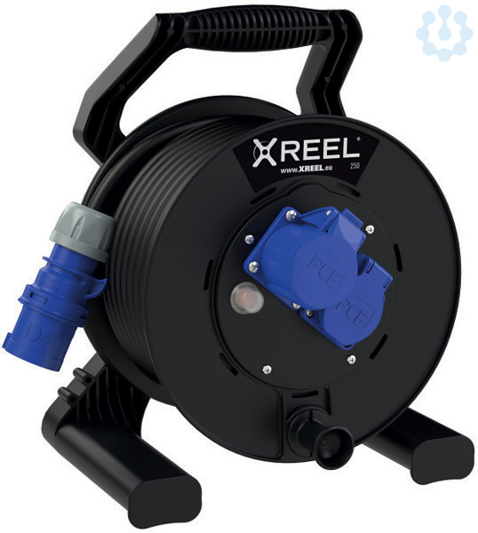 Kabeltrommel XREEL250; Kunststofftrommel (schwarz) mit zentral angeordneter, innenliegender Bremsvorrichtung; Abgedichteter Anschlussraum; Stabiles Kunststoffgestell (schwarz) mit ergonomisch geformtem Tragegriff; Zentralscheibe mit 1 CEE Anbausteckdosen 16/3 6h (313-6f5) und 1 Schutzkontakt Anbausteckdose österr./deutsch. System mit Klappdeckel und Dichtrand (105-0bsw); Nennspannung: 230V ; Nennstrom: 16A; Schutzart Anbaudosen: IP54; 1 Thermoschutzschalter; 20m Kabel schwarz H07RN-F 3G2,5mm2; CEE Stecker 16/3 6h IP44 vernickelt (013-6v); Kabeltrommel betriebsfertig verdrahtet; Richtlinie (RoHS) 2011/65/EU; Niederspannungsrichtlinie NSpRl 2014/35/EU; Beständigkeit gegenüber UV-Strahlung nach ISO 4892-2; nach Norm IEC/EN 61316; Schutzart Gesamtsystem: IP54; entspricht der BGI608 K2