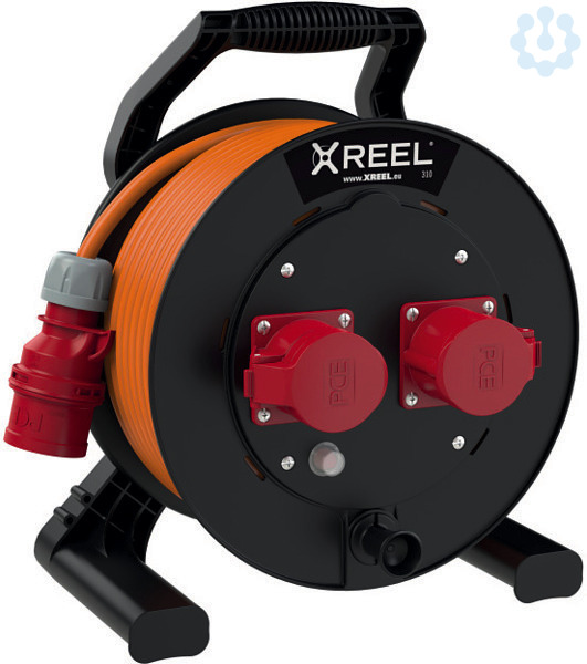 Kabeltrommel XREEL310; Kunststofftrommel (schwarz) mit zentral angeordneter, innenliegender Bremsvorrichtung; Abgedichteter Anschlussraum; Stabiles Kunststoffgestell (schwarz) mit ergonomisch geformtem Tragegriff; Zentralscheibe mit 2 CEE Anbausteckdosen 16/5 6h (315-6f7); Nennspannung: 400V ; Nennstrom: 16A; Schutzart Anbaudosen: IP54; 30m Kabel orange H07BQ-F 5G2,5mm2; CEE Stecker 16/5 6h IP44 vernickelt (015-6v); XREEL310 betriebsfertig verdrahtet; Richtlinie (RoHS) 2011/65/EU; Niederspannungsrichtlinie NSpRl 2014/35/EU; Beständigkeit gegenüber UV-Strahlung nach ISO 4892-2; nach Norm IEC/EN 61316; Schutzart Gesamtsystem: IP54; entspricht der BGI608 K2