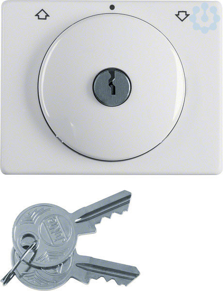 Z.-Stk. mit Schloss für Jalousie-Schlüsselschalter Arsys polarweiß, glänzend. Zentralstück mit Schloss für Jalousie-Schlüsselschalter, mit Aufdruck, nur Taster-Funktion, 2 Schlüsseln (gleichschließend), Schlüssel in 0-Stellung abziehbar.