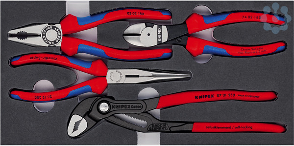 00 20 01 V15 Zangen-Set In Schaumstoffeinlage für Werkbank und Werkstattwagen. Zur übersichtlichen Aufbewahrung der Werkzeuge. Präzise Mulden für die Aufnahme der Zangen. Abmessungen der Schaumstoffeinlage (B x H x T): 335 x 33 x 165 mm. Werkstoff: zweifarbiger, geschlossenporiger Schaumstoff. vier Zangen in Schaumstoffeinlage. Lieferumfang: 1 x 03 02 180 KNIPEX Kombizange, 1 x 87 01 250 KNIPEX Cobra® Hightech-Wasserpumpenzange, 1 x 74 02 180 KNIPEX Kraft-Seitenschneider, 1 x 26 12 200 KNIPEX Flachrundzange mit Schneide (Storchschnabelzange),