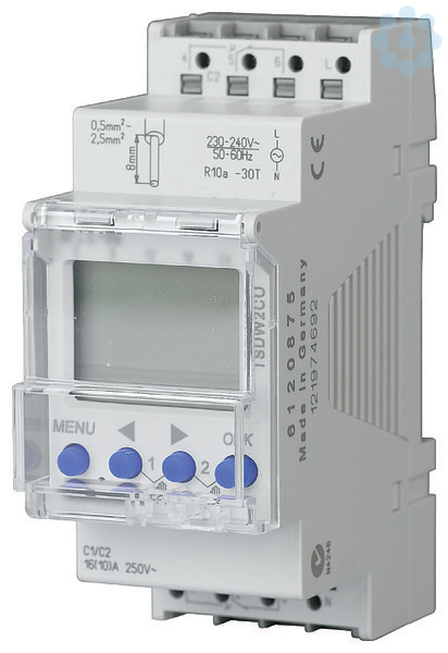 Digitale Zeitschaltuhr mit Wochenprogramm für DIN-Schiene, Federsteckklemmen, textorientierte Bedienerführung im Display, 56 Speicherplatze, Schnittstelle für Speicherkarte (PC-Programmierung), 10 Jahre Gangreserve (Lithium-Batterie), Nulldurchgangsschaltung für relaisschonendes Schalten und hohe Lampenlasten, EIN-AUS Schaltzeiten, Schaltungsvorwahl, Dauerschaltung EIN/AUS, itegrierter Betriebsstundenzahler, Ferienprogramm, Displaybeleuchtung (abschaltbar), PIN-Codierung, Automatische Sommer-/Winterzeitumschaltung