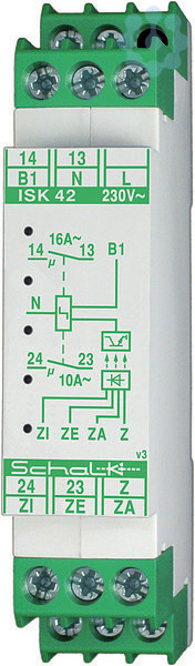 In Elektro-Installationen mit mehreren Unterverteilungen und Fehlerstrom-Schutzschaltern kann mit den dafür entwickelten Schaltgeräten ISK 41, ISK 42 eine wirtschaftliche Zentral-EIN-AUS-Steuerung aufgebaut werden. Die Zentral-Steuereingänge sind durch Ein- und Ausgänge der Versorgungsseite galvanisch getrennt und können mit Spannungen von 8-230V AC oder DC angesteuert werden. Der ISK 42 verfügt zusaätzlich über einen zweiten potentialfreien Relaiskontakt (10A Schließer) und eunen Zentral-Impulseingang., Maße: 18x55mm, 230V AC - 2S pf 16/10A