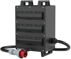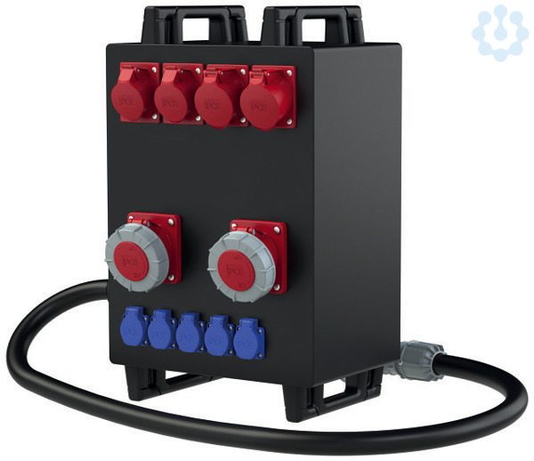 Vollgummiverteiler Modell ZIRL IP54 527x400x270(HxBxT) universal; mit 2x Tragegriffe oben und 2x Stellfüße unten (stapelbar); 2m Kabel H07RN-F 5G35 schwarz mit CEE-Stecker 125A 5p 400V 6h; 2xCEE-Steckdose 63A 5p 400V IP67 abges. ü. 2xLS 63A 3p C (vor FI´s); 2xCEE-Steckdose 32A 5p 400V abgesichert ü. 2xLS 32A 3p C (vor FI´s); 2xCEE-Steckdose 16A 5p 400V abgesichert ü. 2xLS 16A 3p C; 5xSK-Steckdose 16A 250V IP54 abgesichert ü. 5xLS 16A 1p C; 2xFI 63A/4/0.03A (TYP A 63AT) über 2xCEE 63/5 Ausgänge; 2xFI 40A/4/0.03A (TYP A 40AT) über 2xCEE 32/5 Ausgänge; 1xFI 63A/4/0.03A (TYP A 63AT) über 2xCEE 16/5 und 5xSK-Steckdosen; vorgesichert mit 1x LS 63A 3p C; Leitungsschutzschalter und FI Fabrikat SIEMENS; Verteiler betriebsfertig angeschlossen