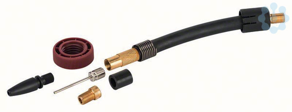 Dieses Zubehör-Set besteht aus Druckluftschlauch, Dichtmutter, Gummidichtung, Ventil für Bälle, Fahrrad und Luftmatratzen.