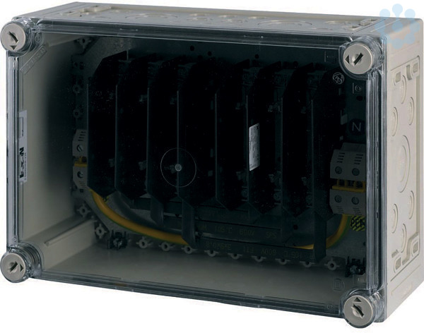 Einzelgehäuse als Zuleitungsverteiler mit Parallelverbindung der Eingangsseiten und 2x Sicherungsunterteilen, Metrische Vorprägungen an allen Seiten, Schutzart IP65, Deckel durchsichtig, Sicherungsunterteil aufgebaut auf Montageplatte aus 3mm Stahlblech, Befestigungslaschen für Wandbefestigung, Zuleitung max. 35qmm, Sicherungseinsatz max. 63A, Bemessungsbetriebsstrom Ie=2x100 A, Sicherungseinsatz Baugröße NH00, Lieferumfang inklusive der Klemmenpaare und DIN-Schienen.