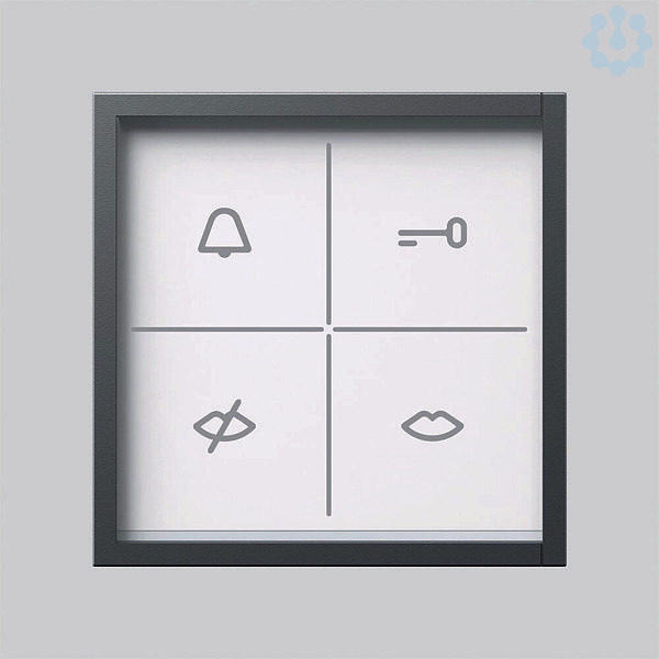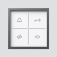 Zustandsanzeige-Modul mit optischer und akustischer Rückmeldung. Jeweils ein LED-hinterleuchtetes Symbol signalisiert die Zustände „Ruf“, „Nicht erreichbar“, „Sprechen“ und „Türöffnen“. Für den Einsatz im Sprechsystem Siedle Access Professional.