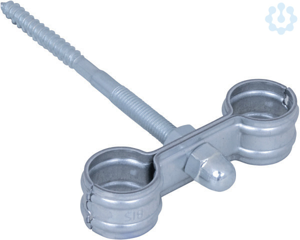 Durch Verzahnung verdrehsicher befestigen die in mehreren Größen erhältlichen Walraven Zwillingschellen (sv) aus sendzimirverzinktem Stahl zwei Stahlheizungsrohre (15 bis 28 Millimeter) gleichzeitig und haben eine Ansatzschraube M8 mit Bund und Hutmutter.
