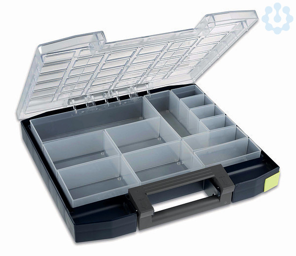 Die boxxser-Serie besteht aus 6 Koffervarianten in 2 unterschiedlichen Höhen, gefertigt aus stoßfestem und bruchsicherem Polycarbonat in einer Doppelwandkonstruktion, Profilraster in Deckel und Boden sichern den Kofferinhalt beim Transport, zwei feste Unterteilungen (neben dem Griff) bieten Raum für die Aufbewahrung von Kleinteilen oder Zubehör. Die integrierten Bodenprofilführungen schützen und sichern den Sortimentskoffer beim Stapeln. Griff mit integrierter Verriegelungssicherung verhindert das Öffnen des Koffers beim Tragen. inkl. 3 x Beschriftungsclips (rot, blau, gelb), 6 x 6 Fächerraster, mit 12 Einsätze