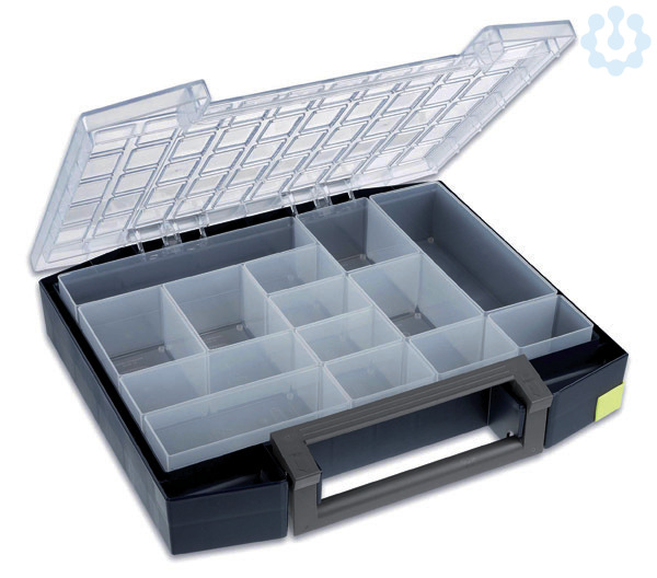 Die boxxser-Serie besteht aus 6 Koffervarianten in 2 unterschiedlichen Höhen, gefertigt aus stoßfestem und bruchsicherem Polycarbonat in einer Doppelwandkonstruktion, Profilraster in Deckel und Boden sichern den Kofferinhalt beim Transport, zwei feste Unterteilungen (neben dem Griff) bieten Raum für die Aufbewahrung von Kleinteilen oder Zubehör. Die integrierten Bodenprofilführungen schützen und sichern den Sortimentskoffer beim Stapeln. Griff mit integrierter Verriegelungssicherung verhindert das Öffnen des Koffers beim Tragen. inkl. 3 x Beschriftungsclips (rot, blau, gelb), 5 x 10 Fächerraster, mit 14 Einsätzen