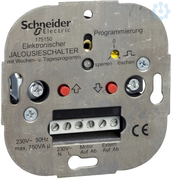 Elektronischer Wochen-Rollladenschalter für manuelles und zeitprogrammiertes Schalten einer Markise/Jalousie/Rolllade 230V AC 50Hz. max. 750VA pro Tag je ein automatischer Auf-und Abbefehl speicherbar automatischer Auf-/Abbefehl abschaltbarTippbetrieb für Jalousien einstellbar Gangreserve 72h. Impulsdauer 180s externer Eingang 230V für Zentral-und Gruppensteuerung. Nebenstellenbetrieb oder Sensoranschluß. wählbar ob mit oder ohne Selbsthaltung. Verrieglung bei Windalarmfunktion (nur einphasiger Betrieb zulässig. nicht potentialfrei).