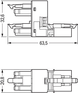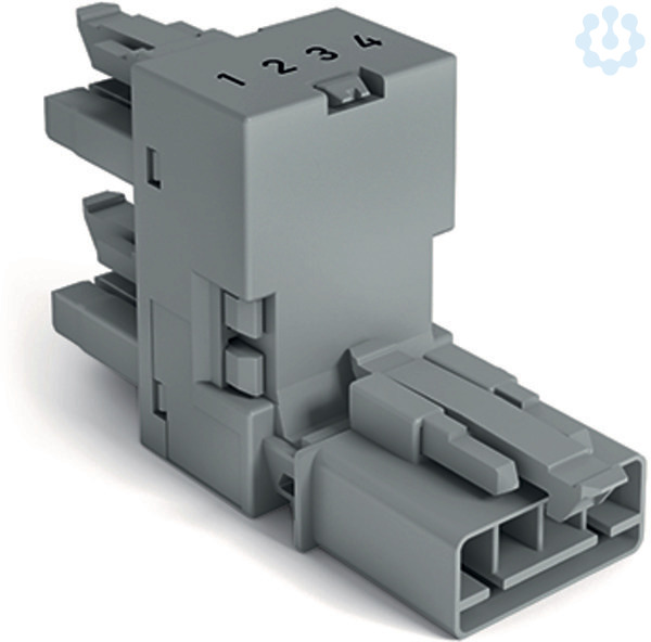 h-Verteiler; 4-polig; Kod. B; 1 Eingang; 2 Ausgänge; einseitige Abgänge; 3 Verriegelungsklinken; für fliegende Verbindungen; grau